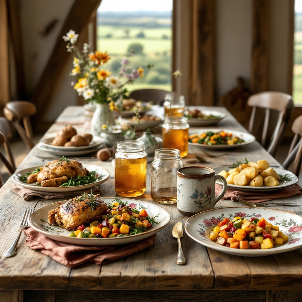 A rustic wooden dining table set with plates of roasted chicken, vegetables, and potatoes, mason jars of iced tea, a floral centerpiece, and a mug, with a window in the background showing a scenic countryside view.