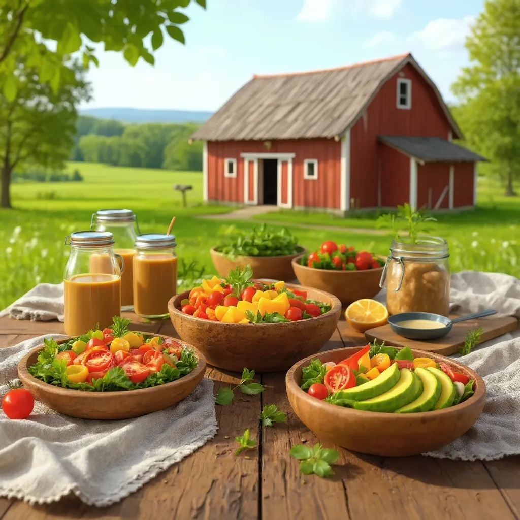 Outdoor picnic table with bowls of fresh salad, sliced avocado, strawberries, cherry tomatoes, and jars of juice in front of a red barn and green field under a blue sky.